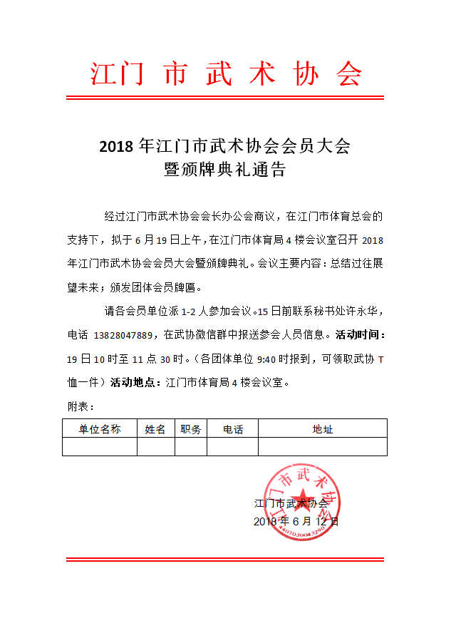 经过江门市武术协会会长办公会商议,在江门市体育总会的支持下, 拟于6月19日上午,在江门市体育局4楼会议室召开2018年江门市武术协会会员大会暨颁牌典礼。